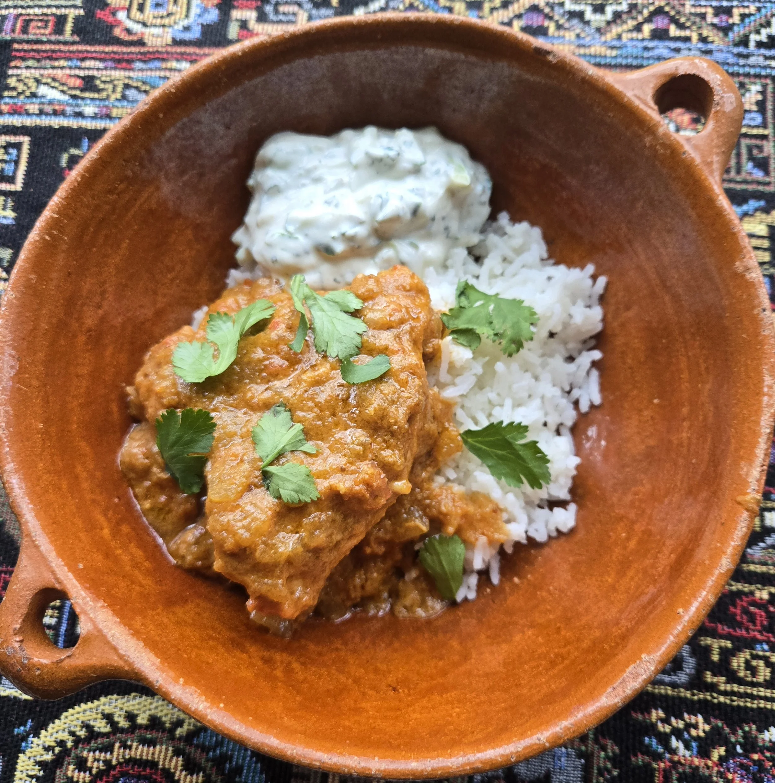 Serve over basmati rice, sprinkled with cilantro leaves, and with the cucumber mint raita.